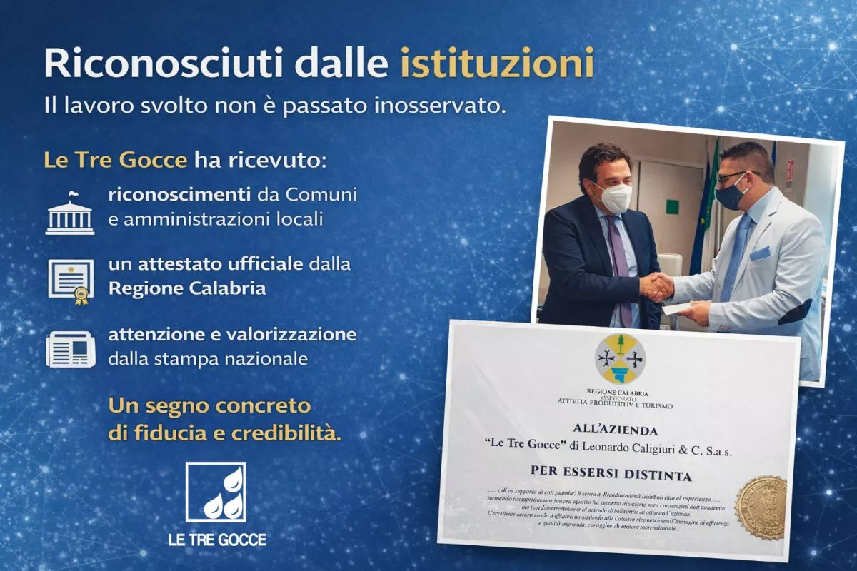 Nel 2008 nasce formalmente Le Tre Gocce di Caligiuri Leonardo C. S.a.s., consolidando un’identità aziendale moderna, strutturata e certificata.